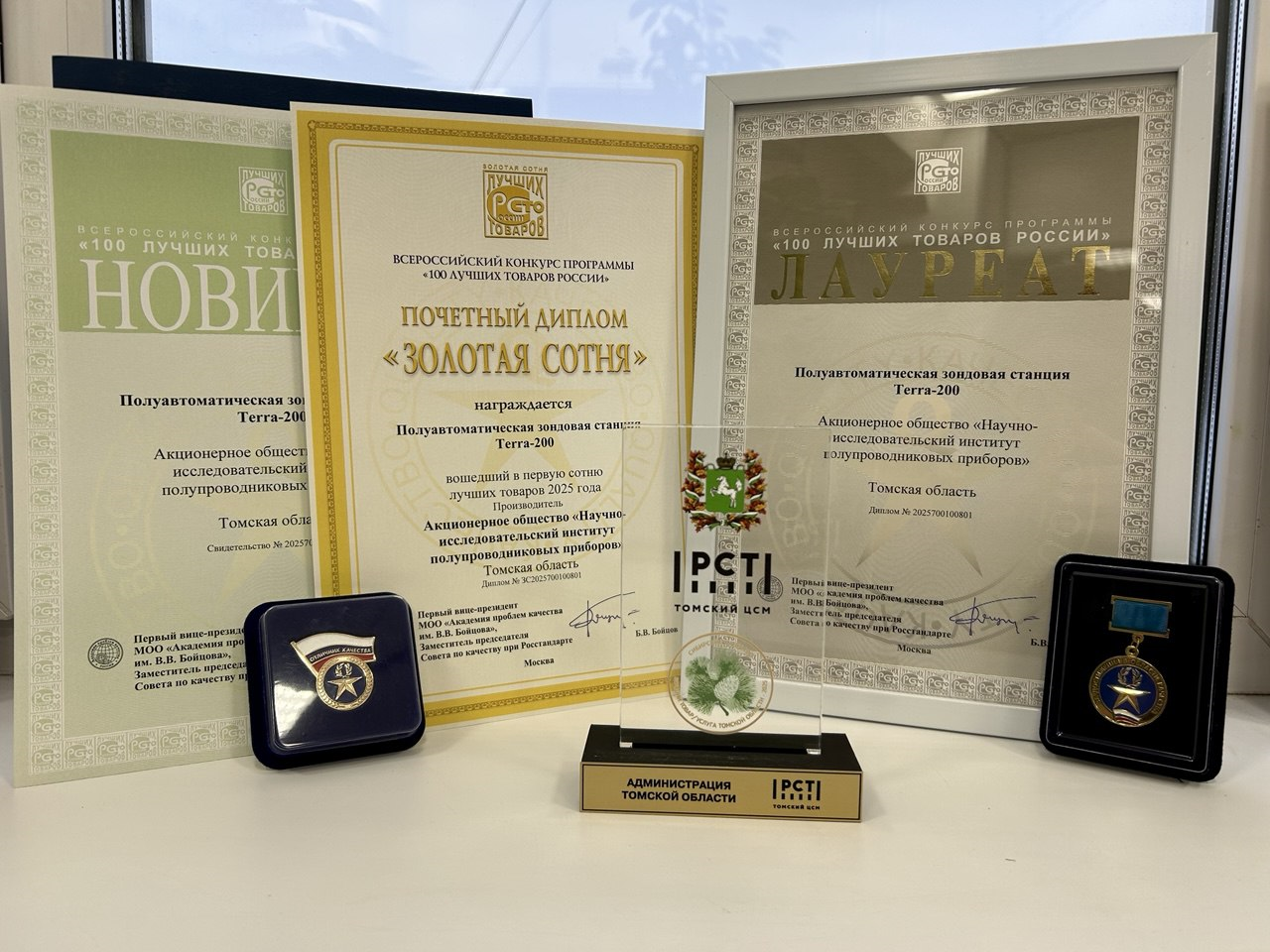 Полуавтоматическая зондовая станция Terra-200, разработанная в Томском научно-исследовательском институте полупроводниковых приборов и устройств (входит в холдинг «Росэл» госкорпорации «Ростех») стала победителем федерального этапа Всероссийского конкурса «100 лучших товаров России» в номинациях «Продукция производственно-технического назначения», «Новинка года» и вошла в «Золотую сотню» товаров 2025 года.