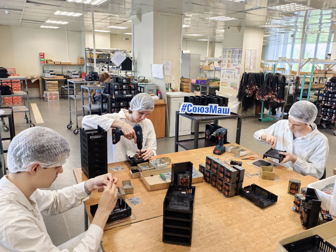 На фото ребята, обучающиеся по направлению подготовки «Монтажник радиоэлектронной аппаратуры и приборов», устанавливают трансформаторы в корпуса зарядных устройств «Кедр-авто».