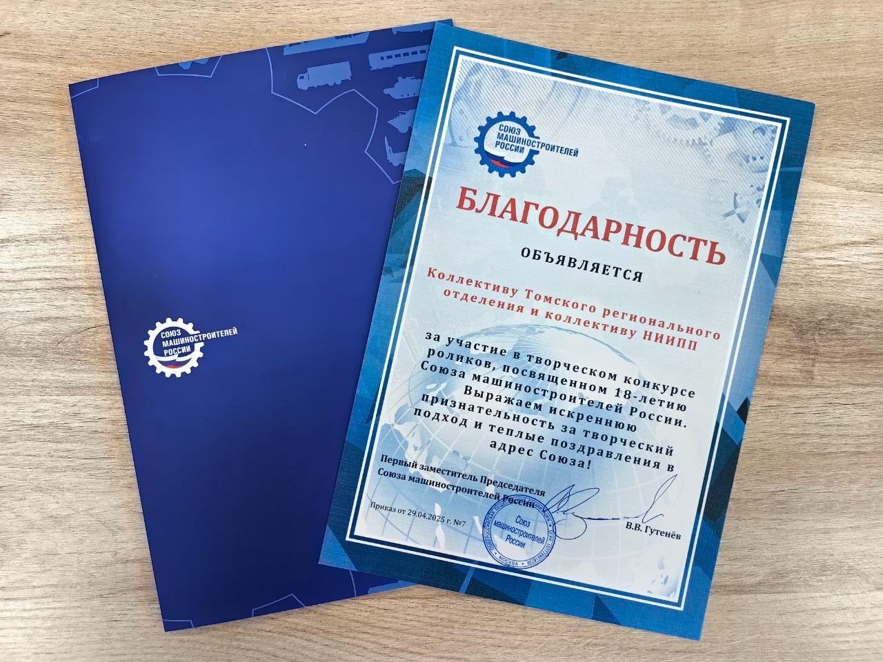 Коллективы Томского регионального отделения СоюзМаш России и АО «Научно-исследовательский институт полупроводниковых приборов» удостоены высокой награды — благодарности Союза машиностроителей России за активное участие наших сотрудников в творческом конкурсе, приуроченному к знаменательной дате - 18-летнему юбилею Союза машиностроителей России.