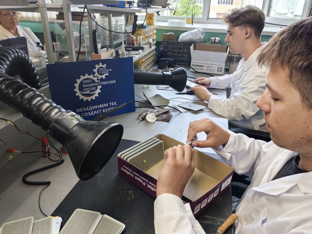 На фото ребята, обучающиеся по направлению подготовки «Монтажник радиоэлектронной аппаратуры и приборов», собирают светодиодные модули.